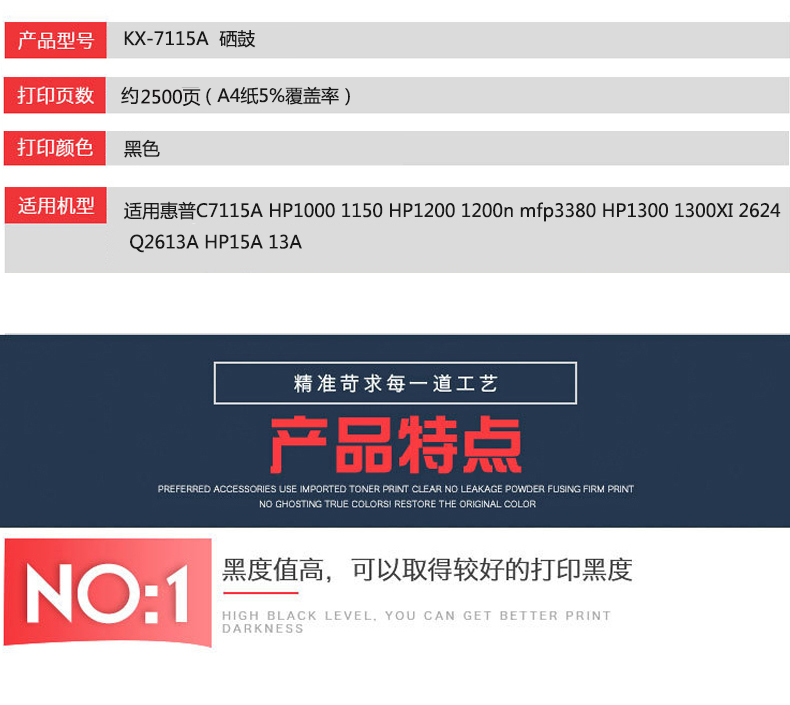 凱欣KX-C7115A 適用惠普C7115A硒鼓HP1000 1150 HP1200 1200n mfp3380 HP1300 1300XI 2624 Q2613A易加粉HP15A 13A硒鼓 全國統(tǒng)一價:275元